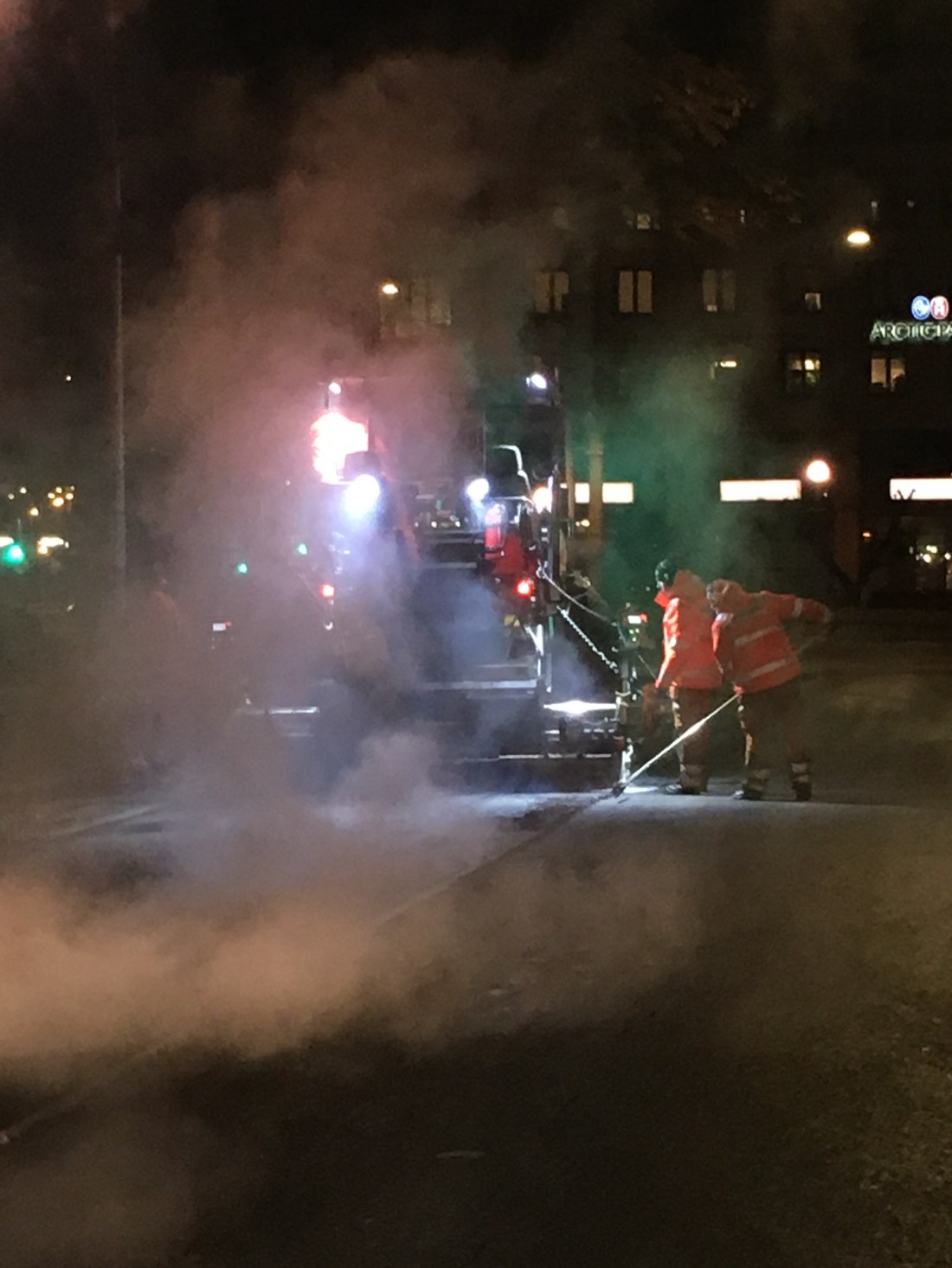 Började lite lugnt nu ikvĂ€ll, mellan tvĂ„ korsningar. Först lades nĂ€t och sen asfalt ovanpĂ„! Helst skulle det inte köras pĂ„ nĂ€tet för det kunde rivas upp eller kanske rent av fastna i ett hjul. Det var ju inte sĂ„ lĂ€tt att hĂ„lla trafiken dĂ€rifrĂ„n med 3 vakter och sĂ„ ”Stina” och ”Bertil” dĂ„, som alltid har kört i den filenđ