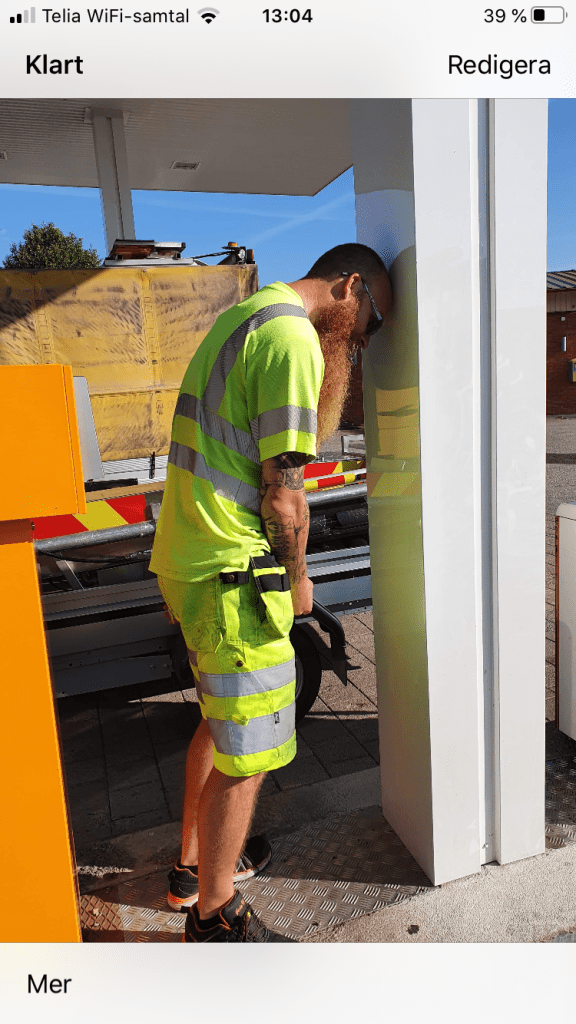 Laddat med vatten, skulle bli Ă€nnu varmare idag. Inte mycket till vind heller. Vi trĂ€ffas vid macken för att tanka upp dagens arbetsfordon. DĂ„ kan det se ut sĂ„ hĂ€rđđđđ