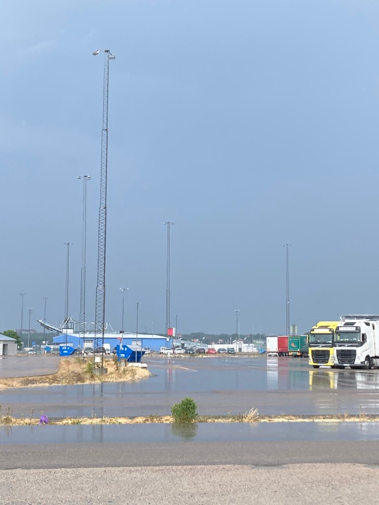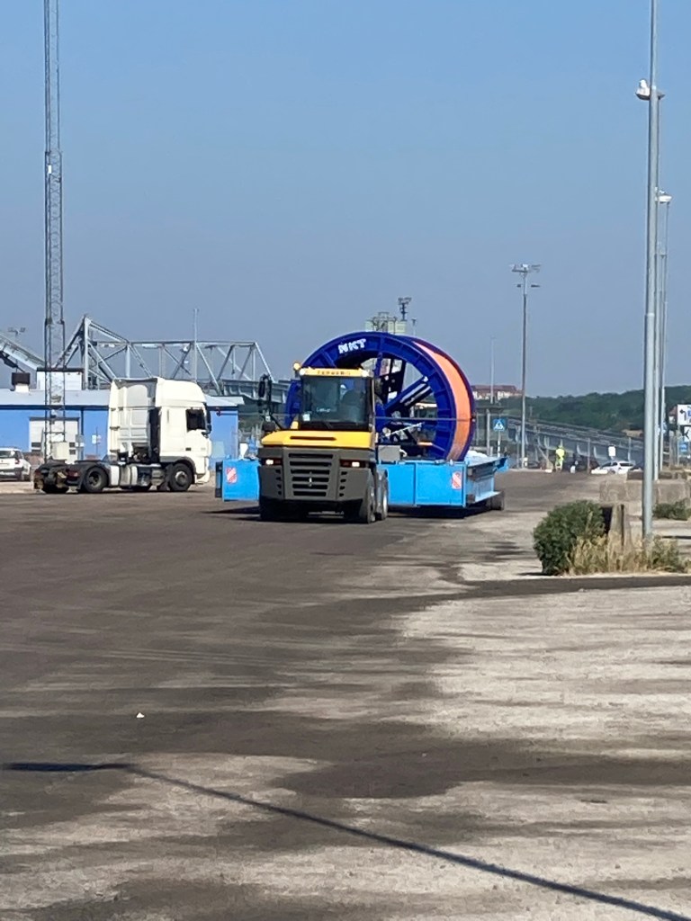 Fler stora ”hjul” som skulle byta plats😂. Det börjar bra och vi möts av Anna som har den radion som vi behöver använda här. Det är en tryckande värme och i stort sett vindstilla här nere vid hamnen. Mycket lastbilar och på väg hit ner mötte vi många som just lämnat färjan. Vi kör ut på våra positioner och inväntar första lasten. De här kabelhjulen är så stora att endast det fordonet får plats på vägen och det är därför vi måste stänga av vägen medan de passerar. Det går långsamt och försiktigt.