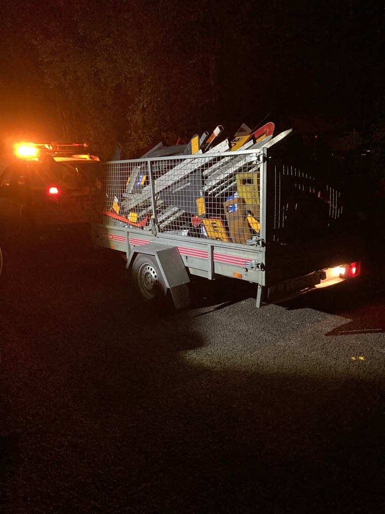 Nu är det snart natt och vi sätter ut skyltar för morgondagens arbete,,,, bara att vända upp på morgonkvisten. Organisationen på skyltsläpet är kaosartat så det tar sin lilla tid! 😂😂