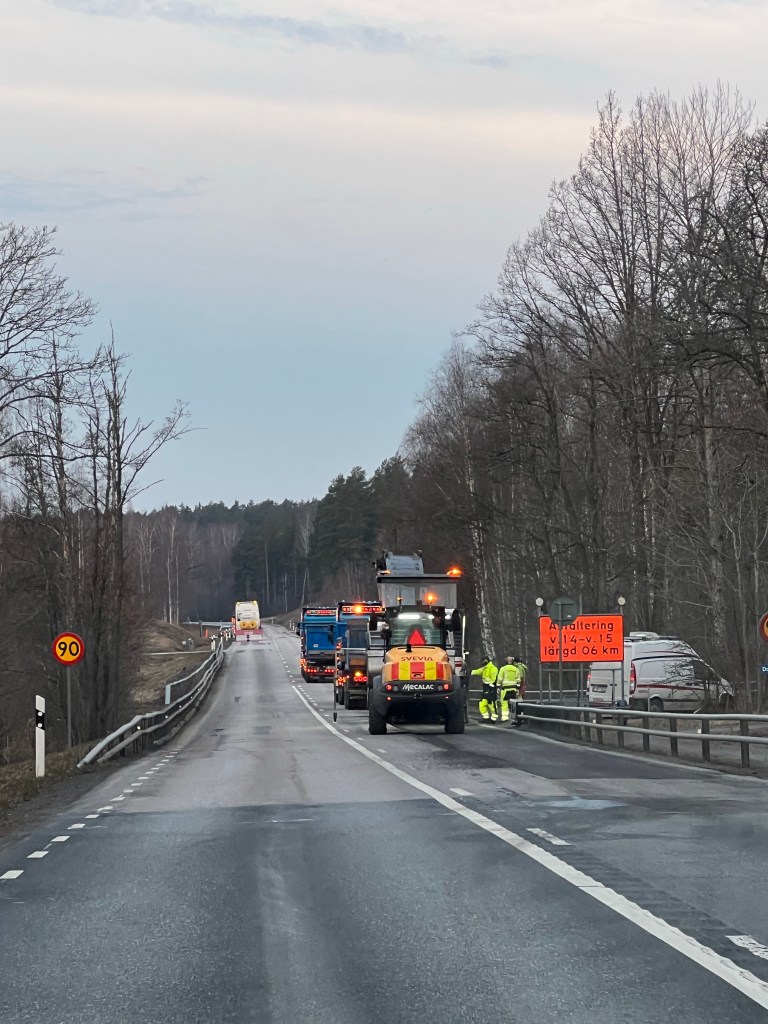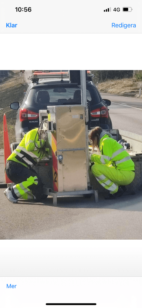 Första bommen står lite pyrt för oss, fick sätta ut den med tma. Normalt hittar vi bättre platser att ställa dem på men det fanns inte att uppbringa här. Men det hela handlar om tid, vi har ju en viss tid vi måste försöka hålla oss till. Det är inte alltid så lätt. Det hänger på så många olika faktorer. T.ex. vågar bilisterna köra förbi läggaren i 20 km, hänger de med i kön, är där ett ”massabyte”, det finns tusen olika orsaker till att vi överskrider våran maxtid. Förståelsen för detta är lika med noll emellanåt. Det är alltid lätt att klaga,,,, gärna utan att veta eller förstå helheten. Vi gör det bästa vi kan för att det ska vara så smärtfritt som möjligt för er bilister utan att tumma på säkerheten för den är prio 1 för oss. Säkerhet för alla och framför allt vill ju vi som jobbar så här att alla våra kollegor ska kunna åka hem hela, efter en jobbvecka.