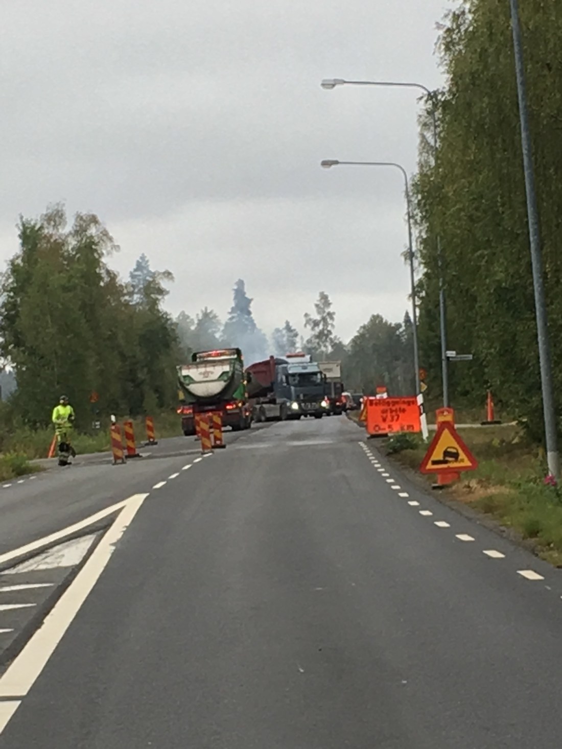 Idag har det inte heller varit lika mycket trafik, brukar vara så dag 2, folk väljer en annan väg och det är vi tacksamma för. Inte heller så många ”busiga” bilister som struntat i invänta-lots-skyltarna! Tyvärr kan man inte undvika att det blir väntetider, ibland långa😞 allt beror på vad som händer inne i arbetsområdet. Det kan vara ett byte av massabilar t. ex. som tar ett par minuter extra, en vändning av maskiner, ja, you name it! Vissa saker måste fixas utan bilister i närheten, allt för säkerheten för alla. Undrar ni något får ni gärna fråga, vi är ju trots allt där för eran skull!