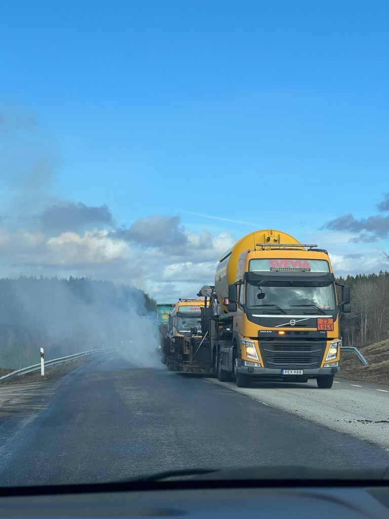 Just nu är det väldigt trångt, det tar verkligen lång tid att få igenom bilar och framför allt lastbilarna. Helst när de ska köra förbi våra ”heatrar ”. De värmer ju upp asfalten med gasol, för att återanvändas och blandas med den nya. Där är otroligt varmt och ibland kan det komma en å annan låga. Då blir det ännu äckligare att köra förbi för en ovan bilist.